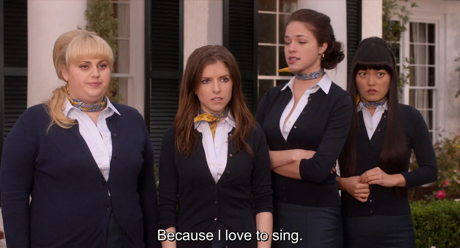 Cast: Anna Kendrick as Beca, Brittany Snow as Chloe, Anna Camp as Aubrey, Rebel Wilson as Fat Amy, Skylar Astin as Jesse, Ester Dean as Cynthia Rose, Hana Mae Lee as Lilly, Alexis Knapp as Stacie, Ben Platt as Benji, Adam DeVine as Bumper, Utkarsh Ambudkar as Donald, Kelley Jakle as Jessica, Shelley Regner as Ashley, Caroline Fourmy as Mary Elise, Wanetah Walmsley as Denise, Nicole Lovince as Kori, Michael Viruet as Unicycle, David Del Rio as Kolio, Elizabeth Banks as Gail, John Michael Higgins as John, John Benjamin Hickey as Dr. Mitchell, Freddie Stroma as Luke, Jinhee Joung as Kimmy Jin, Jacob Wysocki as Justin, Jawan Harris as Timothy, Richard Kohnke as Football Player - ATO, Scott Shilstone as Frat Boy - ATO, Brock Kelly as Howie - ATO, Drew Battles as Emcee at Regionals, Katrina Despain as UMass Greeter, Cameron Deane Stewart as Tom, Kether Donohue as Alice, Karen Gonzales as Barb, Lauren Gros as RIAC Representative #1, Alex Biglane as RIAC Representative #2, Michael Alix as Jewish Student, Tyler Forrest as High Note #1, Joe Lo Truglio as Clef #1, Har Mar Superstar as Clef #2, Jason Jones as Clef #3, Donald Faison as Clef #4, Jabari Thomas as Emcee - Opening, Judd Lormand as Emcee at Semi-Finals, Christopher Mintz-Plasse as Tommy, Steven Bailey as Treble #1, Michael Anaya as Treble #2, Gregory Gorenc as Treble #3, Brian Silver as Treble #4, Wes Lagarde as Treble #5, Jonathan Brannan as Opening Treble #1, Donald Watkins as Opening Treble #2, Jessica Jain as High Note #2, Nate Howard as High Note #7, Ben Haist as BU Harmonics #1, Rose Davis as BU Harmonics #2, Emma Graves as BU Harmonics #4, Emily Rodriguez as BU Harmonics #5, Sawyer McLeod as BU Harmonics #6, Chase Cooksey as BU Harmonics #7, Adam Gilbert as BU Harmonics #8, Megan Dupre as Opening Bellas #1, Brittney Alger as Opening Bellas #2, Monika Guiberteau as Opening Bellas #3, Jessica Poumaroux as Opening Bellas #3, Jackie Tuttle as Opening Bellas #5, Elizabeth Chance as Opening Bellas #6, Margo Melancon as Opening Bellas #7, Brooke Fontenot as Opening Bellas #8, C.J. Perry as Opening Bellas #9 / Footnote #5, Maya Estephanos as Sockapella #1, Brian Mason as Sockapella #2, Xavier Joe Wilcher as Sockapella #3, Julia Friedman as Sockapella #4, Esther Long as Sockapella #5, Aakomon Jones as Sockapella #6, Sora Connor as Footnote #2, Elise Wilson as Footnote #3, Sean Bankhead as Footnote #4, Matthew Laraway as Footnote #6, Madison Benson as Footnote #7, Kenneth Tipton as Footnote #8, Jeremy Strong as Footnote #9, Dylan Cheek as Footnote #10, Naeemah McCowan as Footnote #11, Allison Sahonic as Footnote #12, Codie L. Wiggins as Footnote #13, Kelly Snow as Hullabahoo #1, Nathan Swedberg as Hullabahoo #2, Matthew Savarese as Hullabahoo #3, Sanford Williams as Hullabahoo #4, Charles Miller as Hullabahoo #5, Brandon Borror-Chappell as Hullabahoo #6, Sean McDonald as Hullabahoo #7, Nicholas Cafero as Hullabahoo #8, Alexander Fabian as Hullabahoo #9, Paul Ruess as Hullabahoo #10, Andrew O'Shanick as Hullabahoo #11, Samuel Brennan as Hullabahoo #12, Thaddeus Potter as Hullabahoo #13, Jacob Mainwaring as Hullabahoo #14, Alexander Sneider as Hullabahoo #15, William Laverack as Hullabahoo #16, Renaldo McClinton as Rapper #1, Richard Coleman as ND Auditioner #1, Margaret Osburn as ND Auditioner #2, Dan Iwrey as ND Auditioner #3, Ali Bloomston as ND Auditioner #4, Shawn Barry as ND Auditioner #5, Alexandra Weinroth as ND Auditioner #6, Ciera Dawn Washington as ND Auditioner #7, Felipe Fuentes as ND Auditioner #9, Glen Aucoin as Beatboxer, Deke Sharon as Male Voice #1, Ed Boyer as Male Voice #2, Brandon Kitchel as Male Voice #3, Jasper Randall as Male Voice #4, Drew Seeley as Male Voice #5, Jeff Lewis as Male Voice #6, Laura Dickinson as Female Voice #1, Candice Helfand as Female Voice #2, Windy Wagner as Female Voice #3, Jessica Rotter as Female Voice #4, Kari Kimmel as Female Voice #5, Kala Balch as Female Voice #6, Emily Benford as Female Voice #7